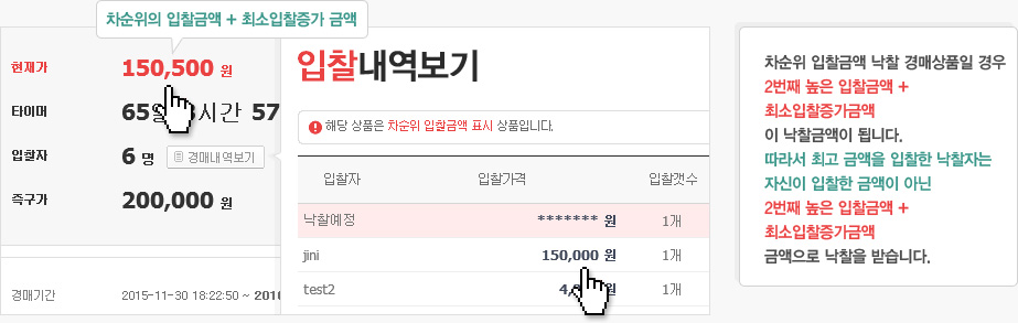 -상세페이지에 출력되는 현재가에 차순위입찰금액 + 최소입찰증가금액이 출력됩니다.